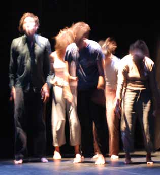 Le second temps a consisté à créer concrètement cette pièce. Chaque interprète a du traverser les partitions et trouver sa place. Le processus basé sur une écriture formelle (traits, signes, codes), a permis un engagement des interprètes qui a généré spontanément des inter-relations entre les personnes. Peu à peu, l’interprétation a créé une fiction, un scénario faisant se succéder des moments de réalité et de rêve. L’écriture s’est prolongée aussi bien par extrapolation que par simple appropriation. Ainsi le récit est ouvert et se construit par strates, mémoire activée des corps en constante recherche. C’est sans doute pour cette raison que De l’avant invariablement nous amène ailleurs que là où nous croyons être.