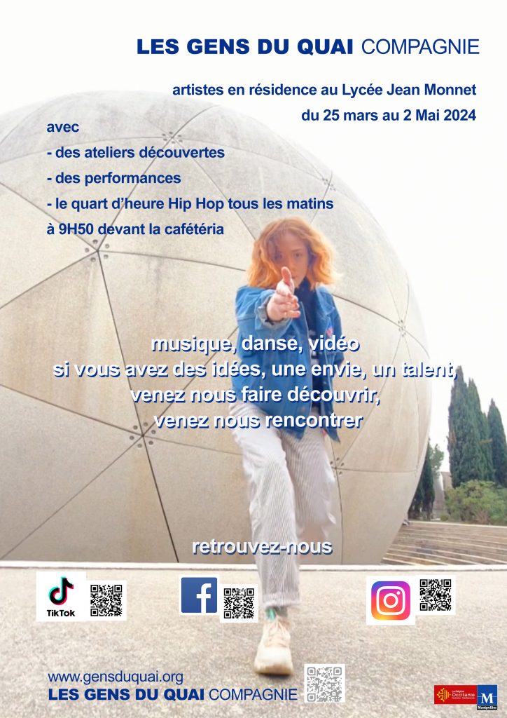 artistes en résidence au Lycée Jean Monnet de Montpellier du 25 mars au 2 Mai 2024 avec des ateliers découvertes, des performances, le quart d’heure Hip Hop tous les matins à 9H50 devant la cafétéria > musique, danse, vidéo, si vous avez des idées, une envie, un talent, venez nous faire découvrir, venez nous rencontrer – suivez la résidence chaque jour sur Tiktok https://www.tiktok.com/@lesgensduquai