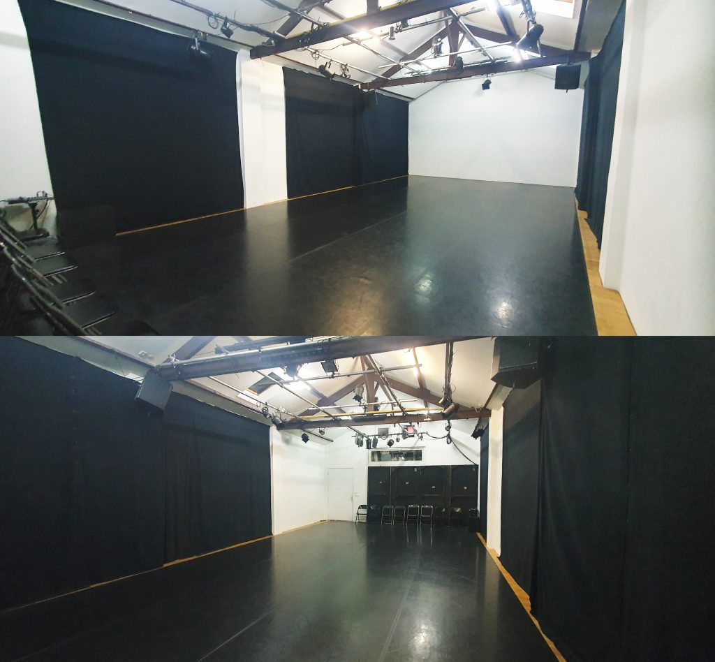Le lieu : un studio de danse, un studio son, un bureau, une salle d’eau et une cour. Dimension du studio de danse : 12m x 6,50m avec plancher et tapis de danse, équipé en son et lumières.